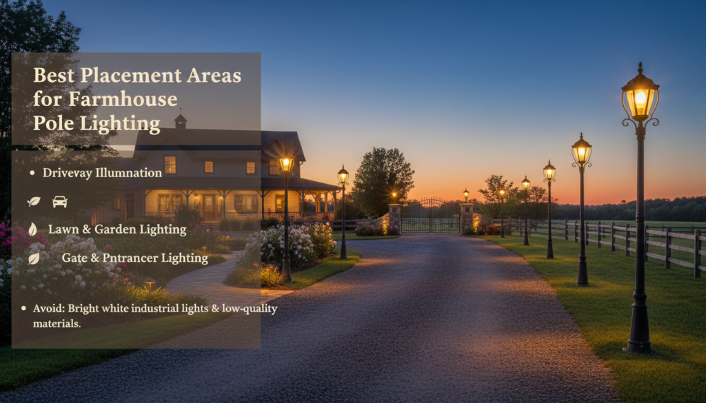 For farmhouse driveway pole lighting ideas, medium-height poles with balanced illumination work best. Explore our complete range of premium outdoor lighting solutions for large properties.