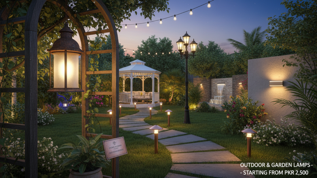 Outdoor illumination improves both security and aesthetics. Outdoor lamp price in Pakistan and outdoor garden lamp price in Pakistan depend on material, size, and LED integration. Options include hanging lamp price for living room, outdoor lighting lamp price in Pakistan, and ceiling lamp price for home in Pakistan.